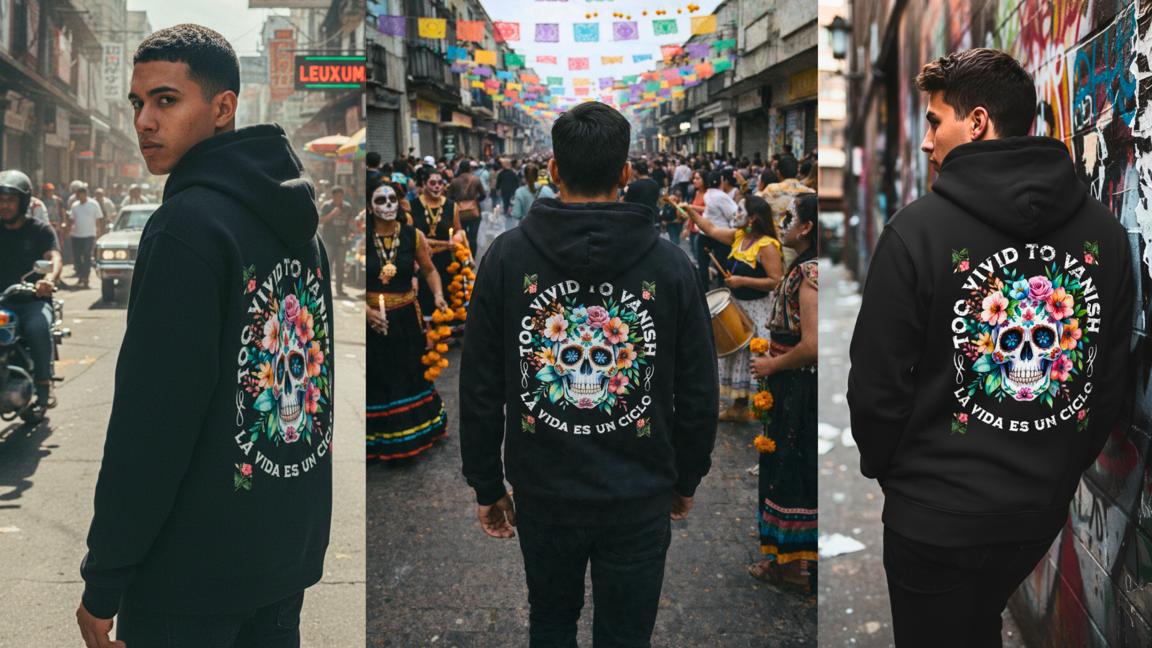 Zwischen flackernden Lichtern, pulsierenden Straßen und lebendiger Kultur entsteht ein Look, der Gegensätze vereint: Leben und Vergänglichkeit, Tradition und Streetstyle, Farbe und Dunkelheit. Der Vivid to Vanish Hoodie trägt diese Spannung direkt auf dem Rücken: kraftvoll, symbolisch und unübersehbar.