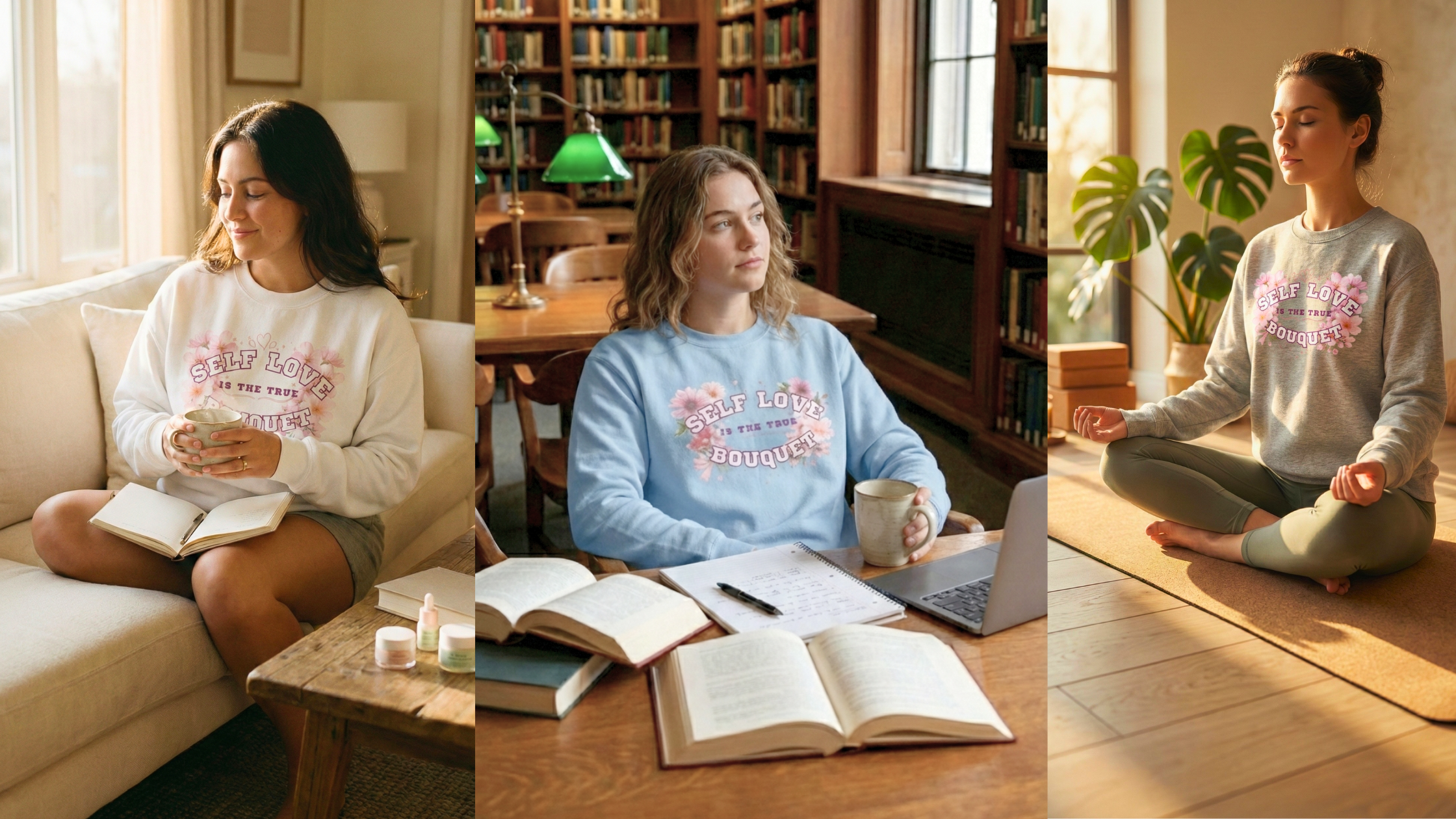 Inmitten von stillen Momenten und sanftem Tageslicht entsteht ein Look, der Selbstfürsorge und innere Balance widerspiegelt. Der Self Love Sweater begleitet Augenblicke der Ruhe.